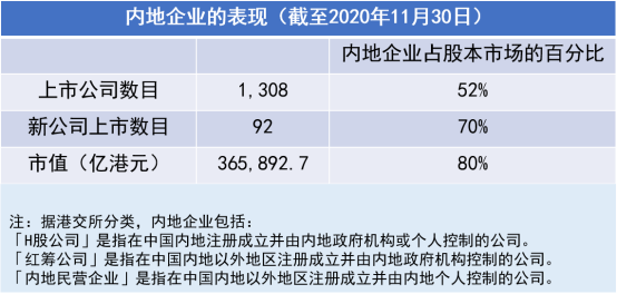 根據港交所統計,截至2020年11月底,共有1308家內地企業在香港上市,占比達到52%,總市值近3659億港元,占比高達80%。同時,今年新上市的內地企業共有92家,包括11家H股公司、1家紅籌公司及80家內地民營企業,占香港全部新上市公司的比例達70%。