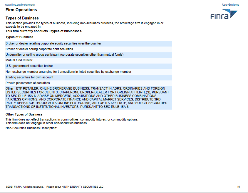 FINRA官網顯示,九久證券美國可從事證券債券銷售交易、保薦承銷、基金零售、自營證券交易、私下配售、網路經紀、ETF零售、投資研究等14項證券業務。